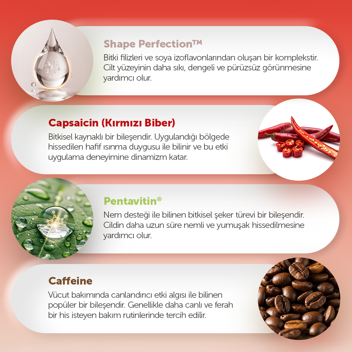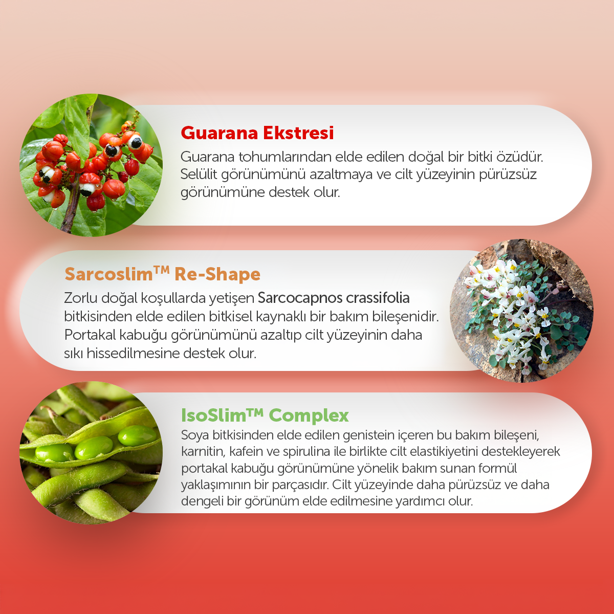 Formülündeki Sarcoslim Re-Shape, IsoSlim Complex ve Shape Perfection, portakal kabuğu görünümünün bakımına yardımcı olur, cilt elastikiyetini destekler ve daha gergin bir his oluşturur. Pentavitin ve Gliserin, cildin uzun süre nemli ve yumuşak hissedilmesine katkı sağlar. Guarana Ekstresi, Avokado yağı, Jojoba yağı ve Skualen ise cilde canlılık verir, besleyici bir bakım sunar ve cilt yüzeyinin daha pürüzsüz hissedilmesine destek olur.