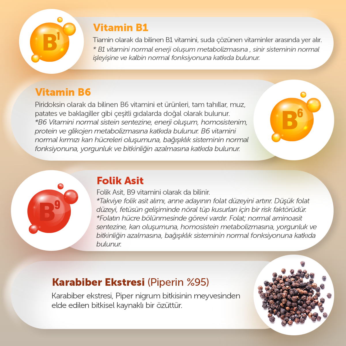Uyarı: Tavsiye edilen günlük alım dozunu aşmayın.Takviye edici gıdalar normal beslenmenin yerine geçemez. Çocukların ulaşamayacağı yerde saklayın. Hastalıkların önlenmesi veya tedavi edilmesi amacıyla kullanılmaz. Hamililik ve emzirme dönemi ile hastalık ve ya ilaç kullanılması durumlarında dokturunuza danışınız. Parti numarası (PRT) ve tavsiye edilen tüketim tarihi (TETT) ambalaj üzerindedir.